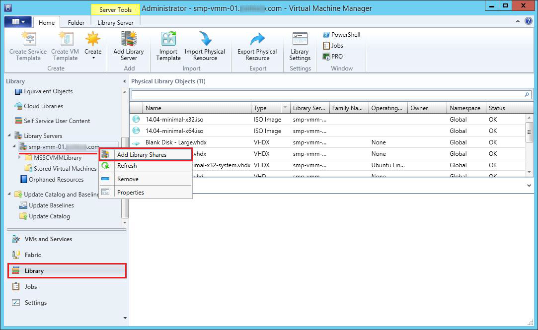 6. In SCVMM, open the Library Servers in the Library workspace, then right-click the library server to which to add the share and select Add Library Shares from the context menu.
