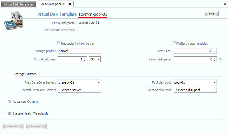 • The storage devices listed under the DataCore SANsymphony server group in SCVMM correspond to virtual disk templates in DataCore SANsymphony software. Virtual disk templates identify the disk pools to use in DataCore SANsymphony software. Templates should be configured in the DataCore SANsymphony server group before adding storage devices in SCVMM. See Virtual Disk Templates for more information.