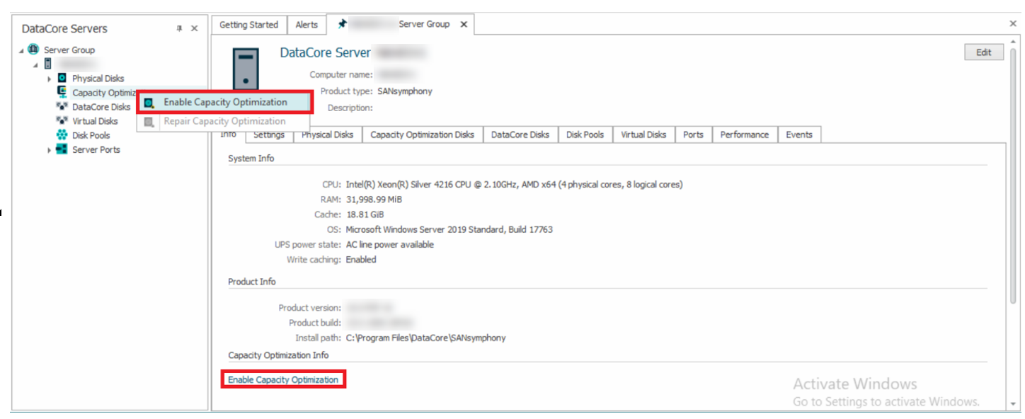 - In the DataCore Servers panel, select the applicable server under Server Group. Right-click Capacity Optimization and select Enable Capacity Optimization.