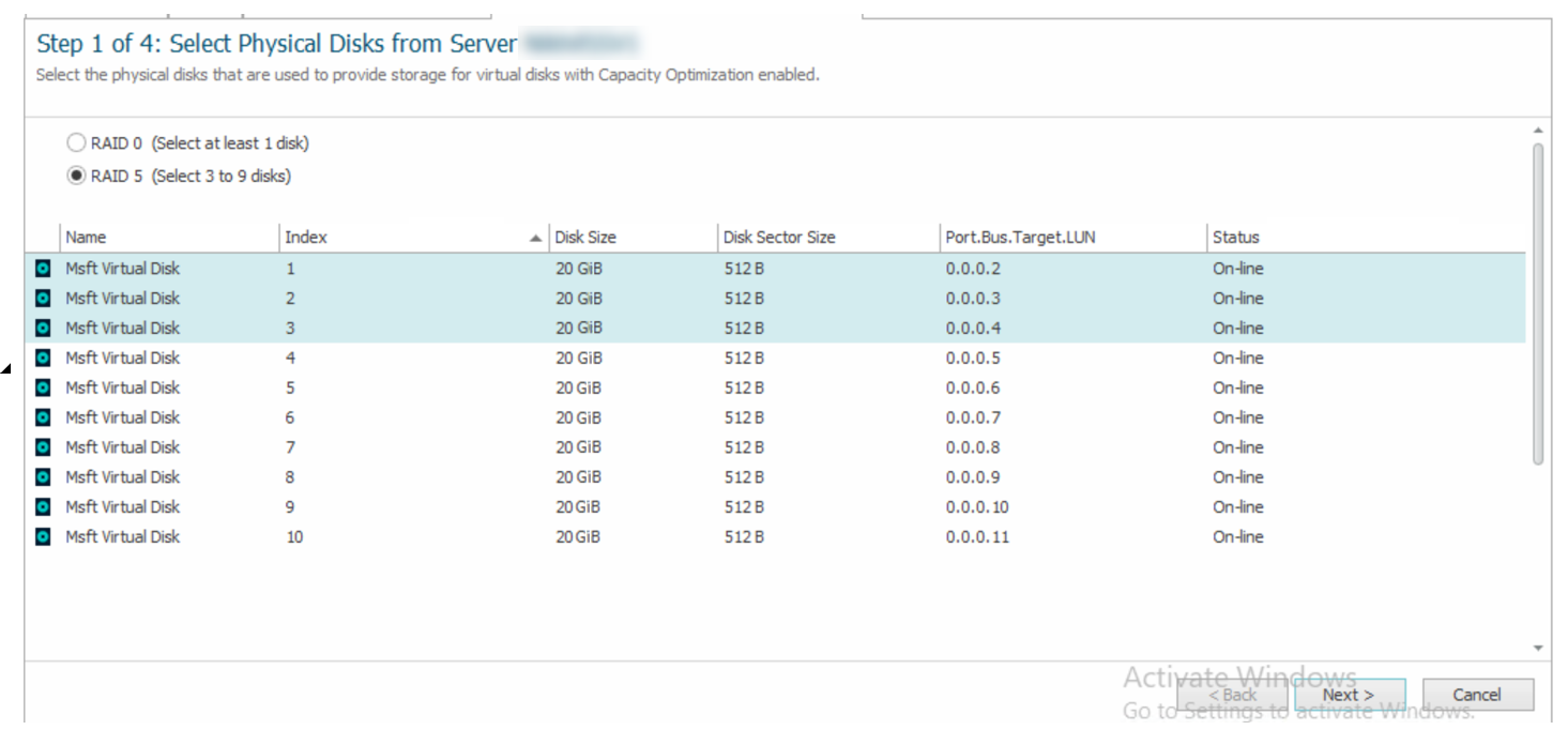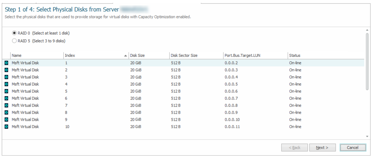 - On Step 1 of the wizard, select RAID level (RAID 0 or RAID 5) and the available physical disks that you want to include and click Next.