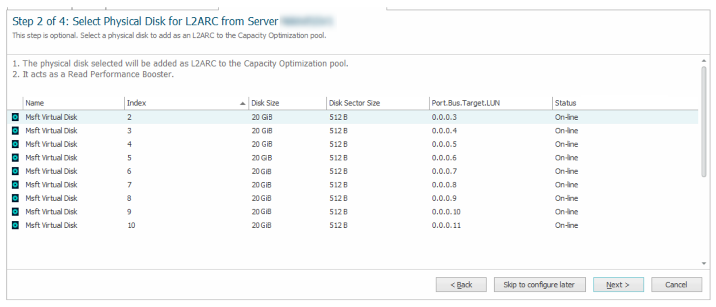 - Click Skip to configure later to configure the L2ARC later. See Add Capacity Optimization disks for more information.