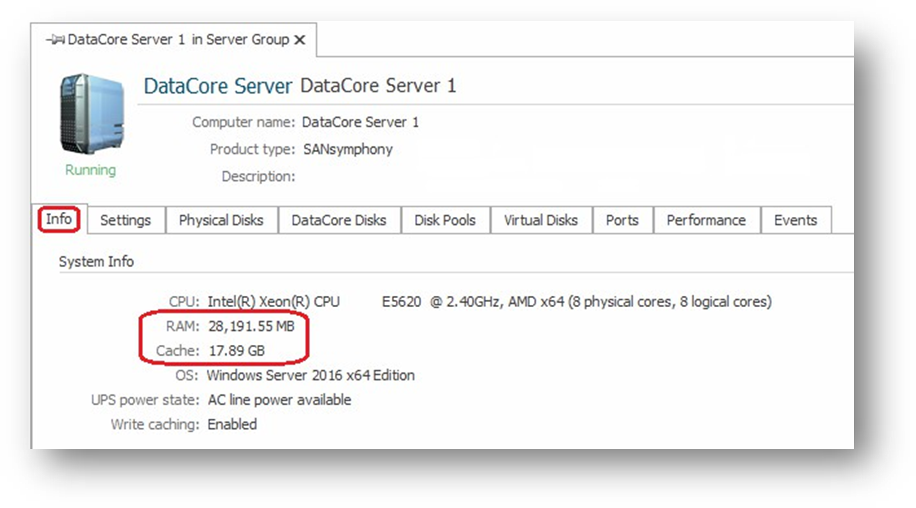 Select the DataCore Server and using the Info tab locate how ‘RAM’ the DataCore Server can see and how much of that has been allocated for use with SANsymphony’s cache.