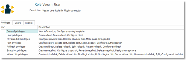 Create an exclusive user role in the SANsymphony server with the appropriate privileges as displayed below.