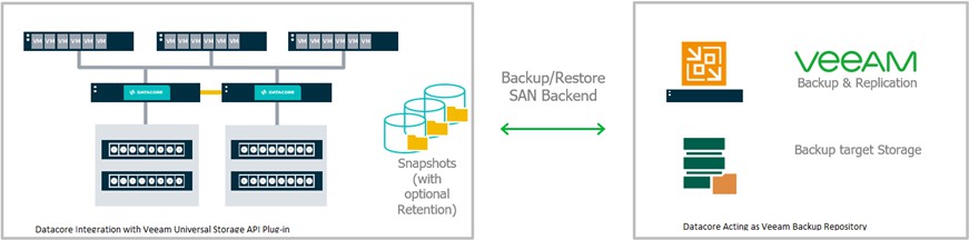 DataCore’s flagship software-defined solution, SANsymphony, offers a Veeam Universal Storage API plug-in, that enables Veeam B&R to use storage snapshots. The storage snapshots can be used irrespective of the brands and models of devices in the virtual storage pool, even if those devices do not offer a Veeam plug-in. These range from onboard NVMe flash and All-Flash Arrays to HDDs. The same streamlined backups apply equally well in the hyperconverged infrastructures, providing flexibility and vendor independence.