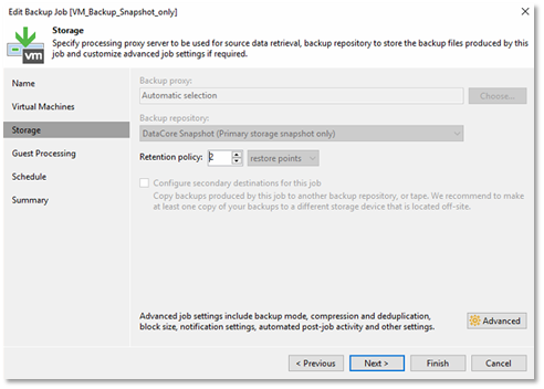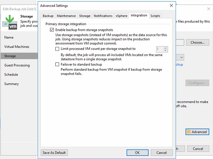 The advanced storage integration setting, Enable Backup from Storage Snapshots for the Veeam B&R backup job is enabled by default. Therefore, this advanced setting will be applicable once the Veeam Storage Plug-in is configured and connected. The setting will not apply if a Veeam Plug-in is not configured. Revisit the existing backup jobs and set this advanced setting according to the defined goals of the backup concept. For more information, see the Veeam B&R documentation.