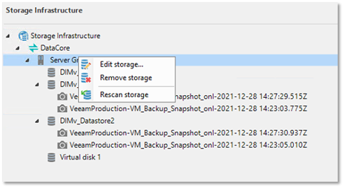 - From the Storage Infrastructure in the Veeam Explorer, right-click the applicable storage and select Rescan Storage to make the rollback point visible, or wait until the regular scan is completed by the Veeam B&R.