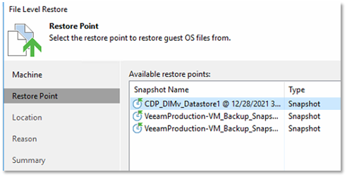 - Under the Restore Point, select the applicable Snapshot Name (Restore Point) from the available restore points.