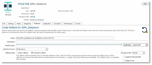 - From the DataCore Management Console, create a rollback with the displayed configuration.