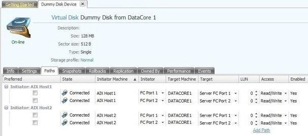 Here is an example of one of these vDisks created on and served from DATACORE1 to both AIX Host 1 and AIX Host 2 as LUN 0 on each of their own Fibre Channel (FC) Ports.