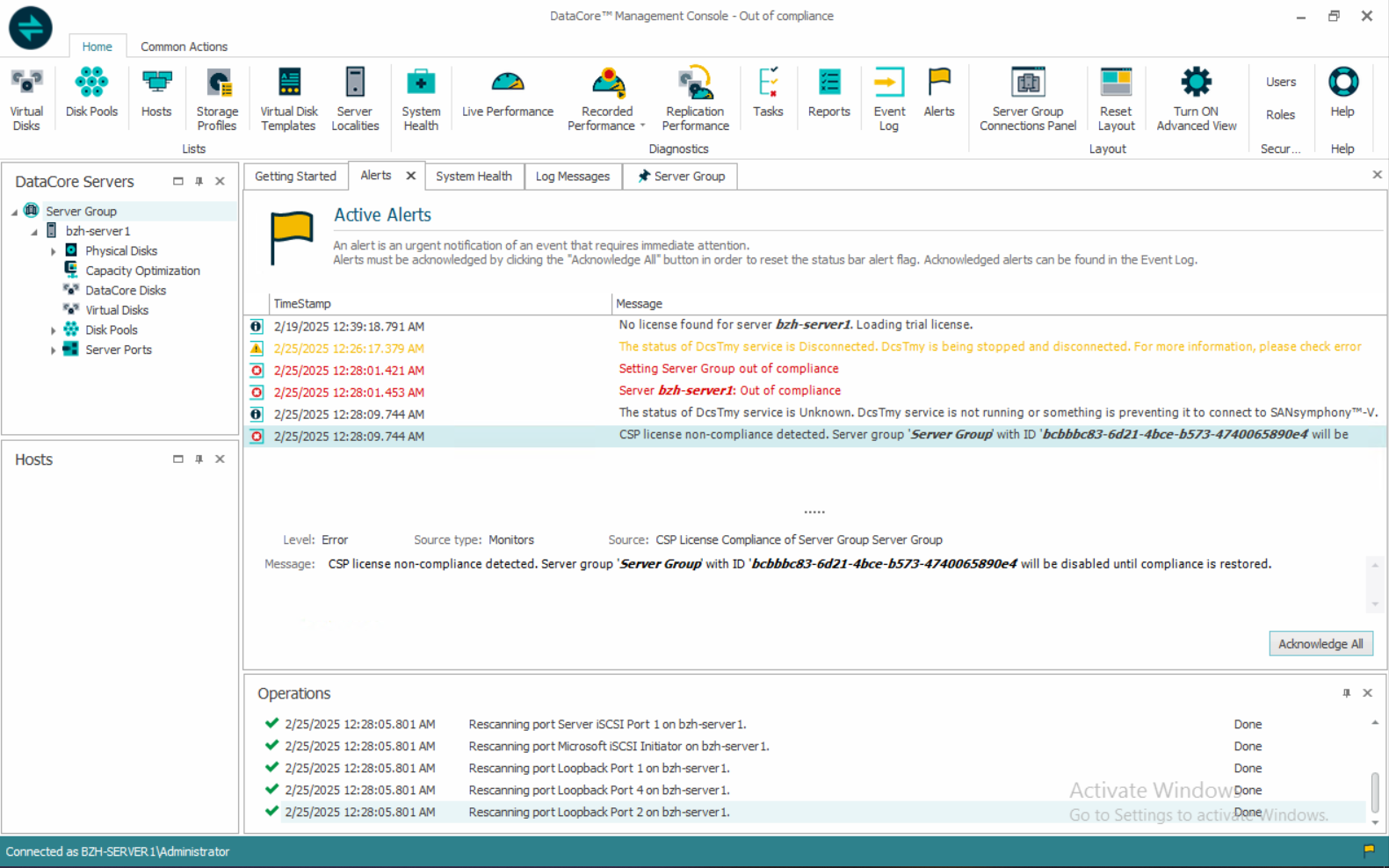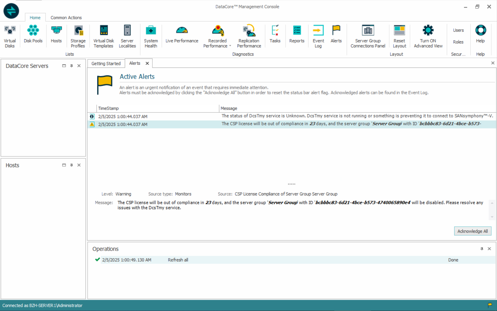 - Managing Alerts: You can view alerts in the System Health tool or in the Alerts/Log Messages section of the DataCore Management Console (DMC). These alerts help you understand the risk to your license compliance based on changes in the DcsTmy service connection status.