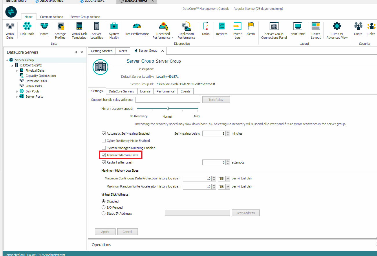 - The Transmit Machine Data setting checkbox is selected by default for CSP license holders. Attempting to uncheck this option triggers the following error: "Transmit Machine Data must be enabled to comply with CSP license terms. If you are not operating under a CSP license and have received this error, contact DataCore Support for assistance." For non-CSP licenses, the setting can be unchecked without impacting system compliance.