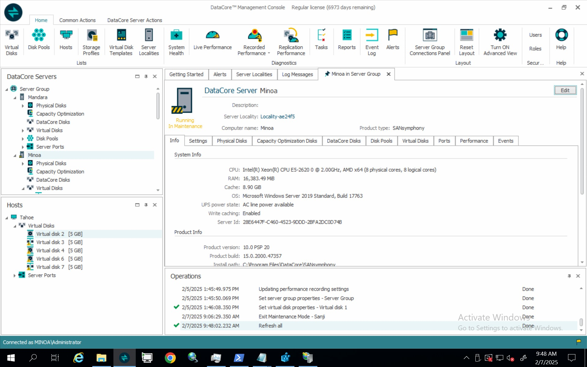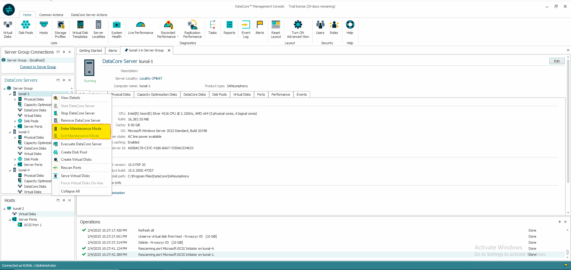 - Alternatively, you can navigate to DataCore Server Actions in the ribbon to click Enter Maintenance Mode or Exit Maintenance Mode.