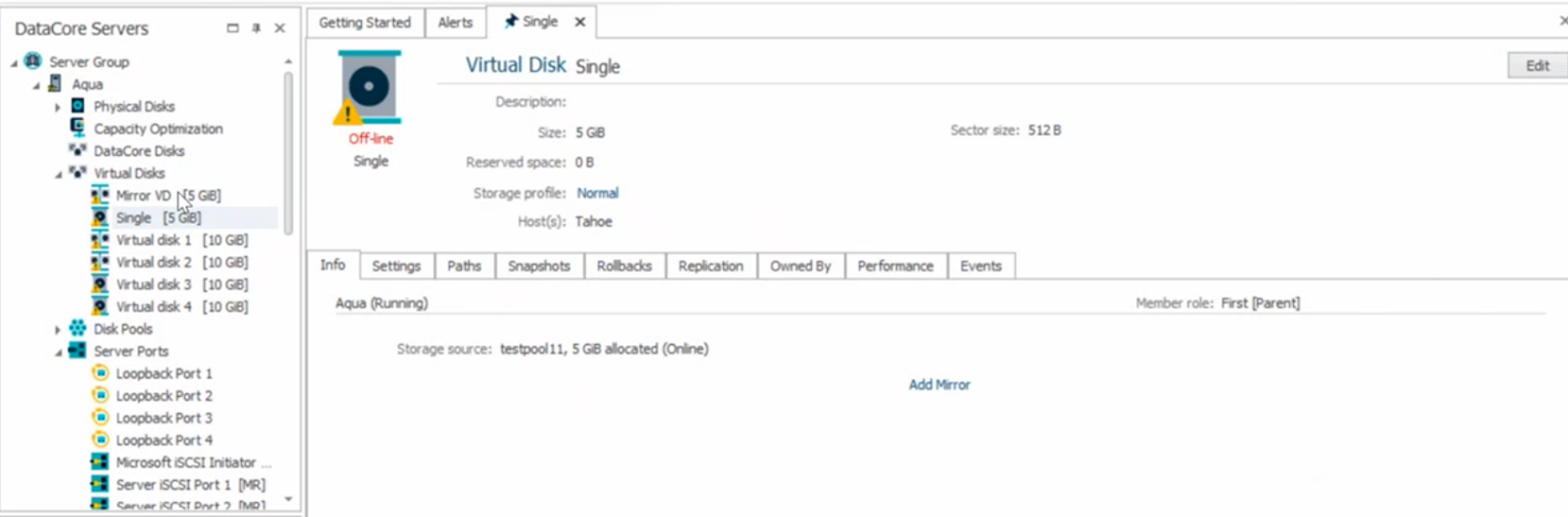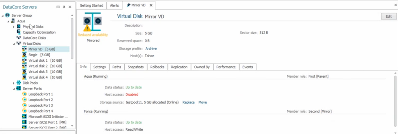- For Mirror Virtual Disks, I/O operations are automatically redirected to the operational server when one path becomes unavailable, ensuring continuous access. The image below displays a 'Reduced availability' warning, indicating that one of the mirrored paths is not fully operational.