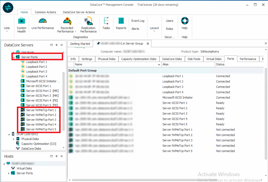The new Server NVMeTcp Ports are visible in the DataCore Management Console > Server Group > Server Ports.