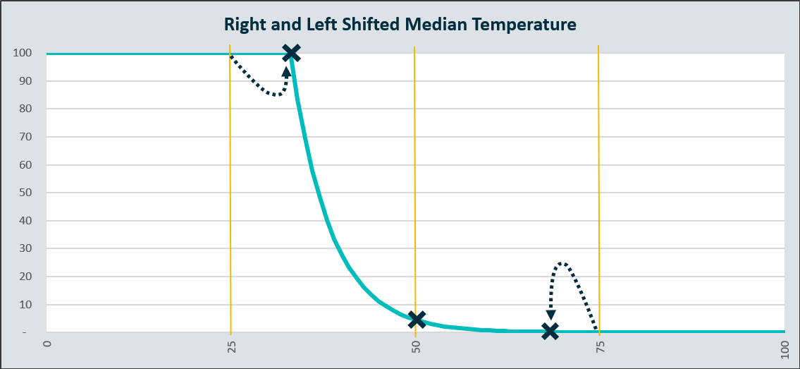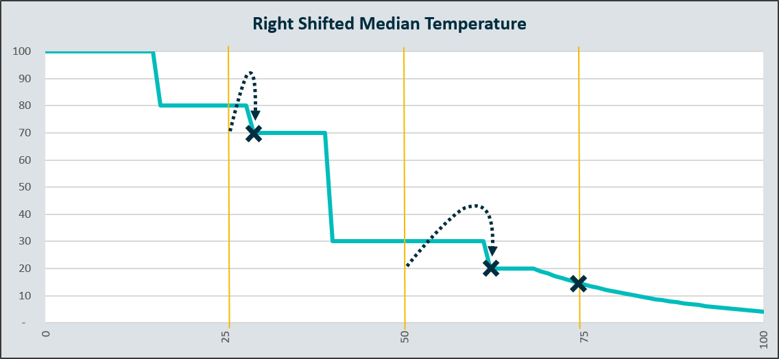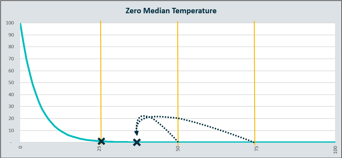 The following graph depicts a plateau condition, where the median temperatures for Lazy and Normal policy have right shifted.