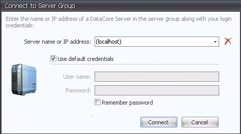 - When the DataCore Management Console is opened, the Connect to Server Group dialog box opens.