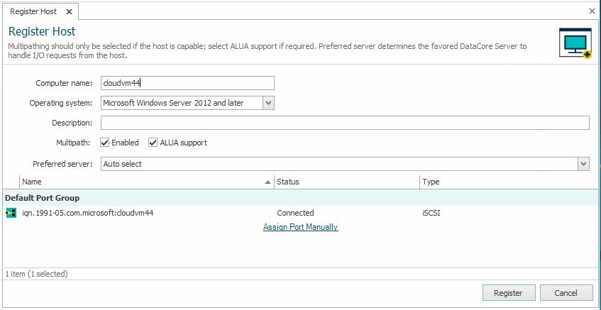Fibre Channel, NVMeTCP, and iSCSI ports usually are automatically discovered in DataCore SANsymphony software. If a port is not automatically discovered, it can be manually registered and assigned to a host. Ports can be assigned during host registration or after.