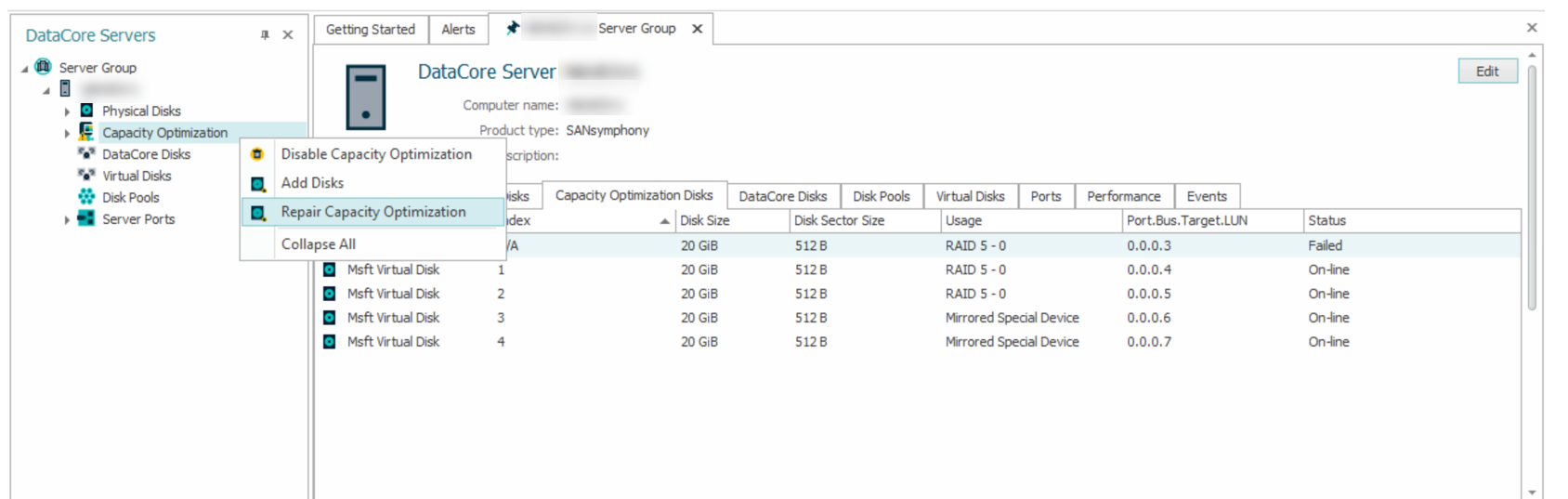 When one or more physical disks in the Capacity Optimization (RAID 0, RAID 5, or Mirrored Special Device) goes missing or gets failed, the Capacity Optimization goes into failed, degraded, or suspended state.