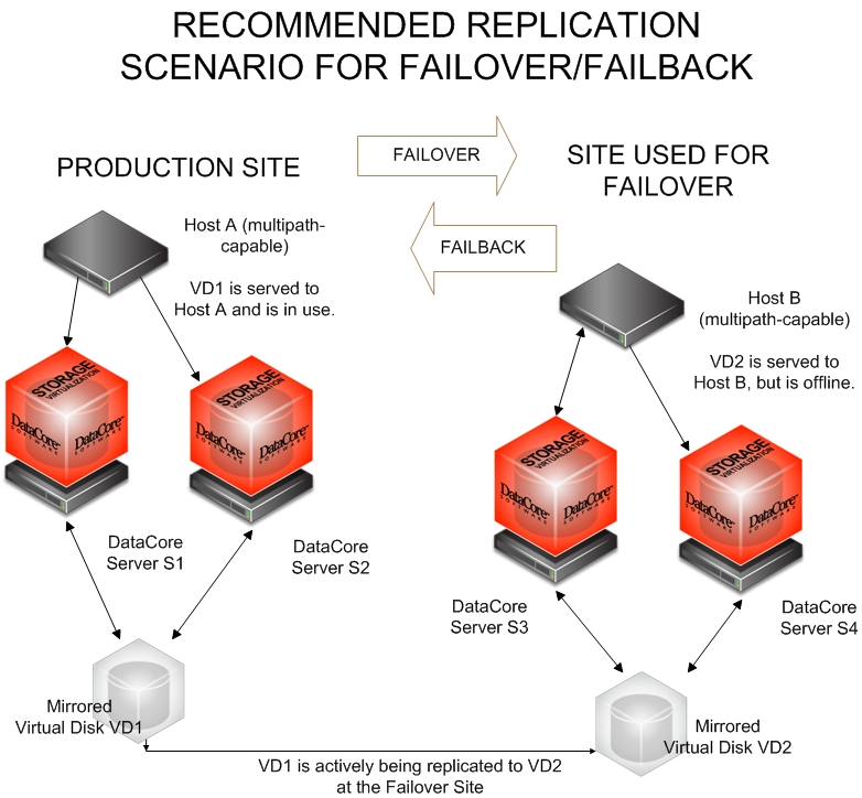 The replication direction can be reversed as required. When a controlled or emergency failover is necessary at the production (source) site, the roles of the source (active) and destination (standby) virtual disks can be swapped. When a failover is required, the replicated virtual disks at the failover site can be activated and made accessible to a host at the failover site. Data changes made by the host at the failover site will be added to the replication buffer created on the DataCore Server at the failover site.