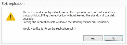 - This time, you will receive a message that the split replication operation will be forced. Click Yes to continue with the operation.