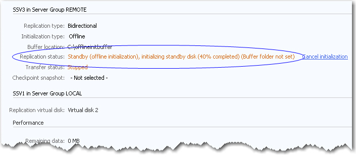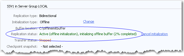 - Click Start offline initialization. The replication will show that the replication is active and the offline buffer is initializing. The percentage complete will be displayed.