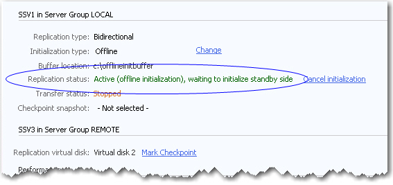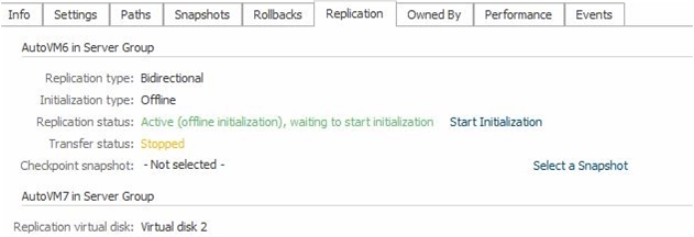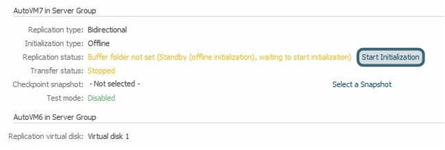 - Click Start offline initialization. The replication will show that the replication is in standby mode and the standby disk is initializing.