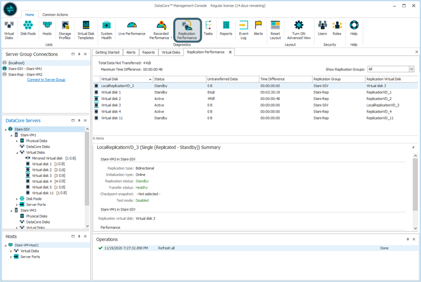 The Replication Performance tab provides visibility into how well replication is doing, or how far behind in data and time it is, in total and for each virtual disk.