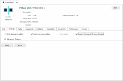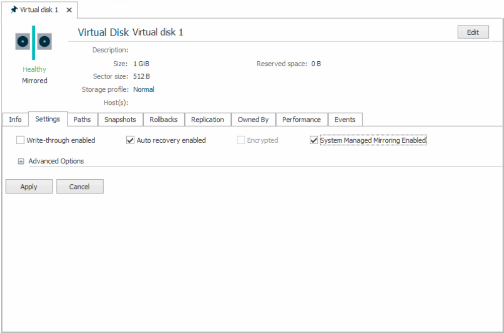There are two ways to enable system managed mirroring for existing virtual disks: on the Settings tab in the Virtual Disk Details panel or with PowerShell.
