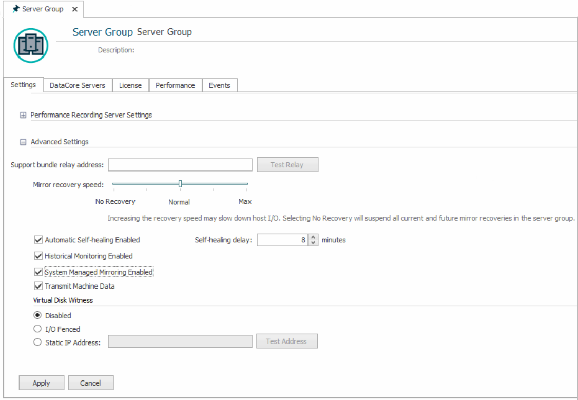 2. In the Advanced Settings area in the Settings tab, select the System Managed Mirroring Enabled check box.