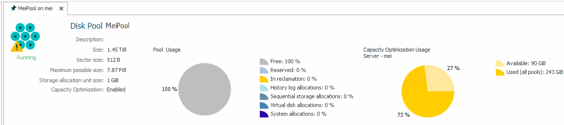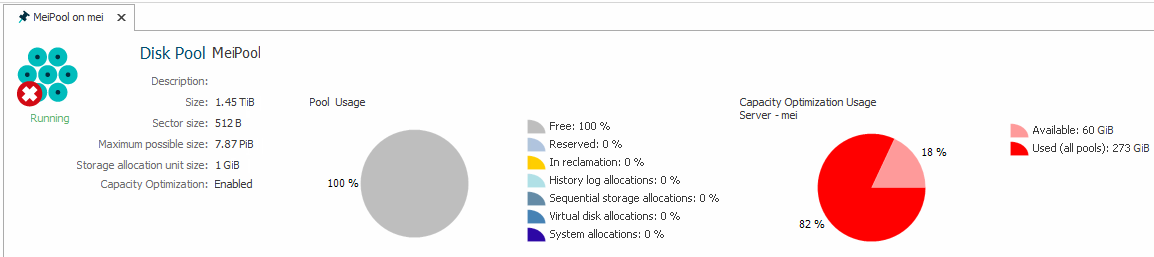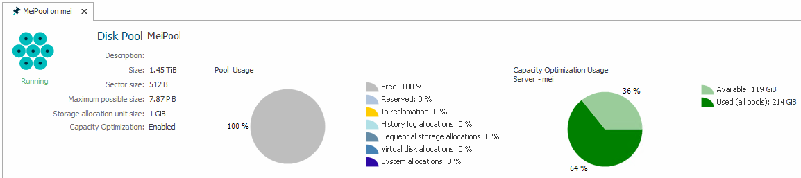 - A Capacity Optimization enabled Disk Pool may take up to 30 seconds to refresh allocation values in the Disk Pool Usage Pie Chart when viewed in the DataCore Management Console. This is a display-only issue. All performance counters and alert monitors that are related to these statistics will have real-time information when queried.