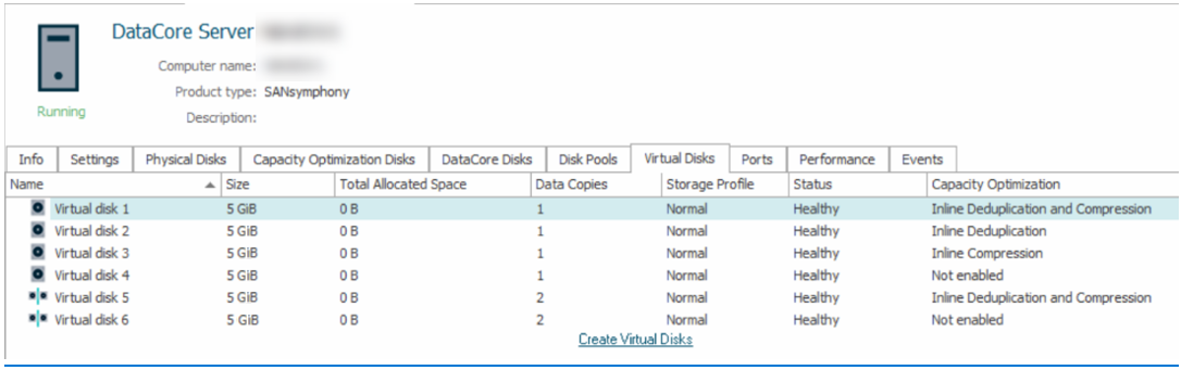 From the Server Details page on the Virtual Disks tab, you can see whether Capacity Optimization settings are enabled for a virtual disk (Inline Deduplication and Compression).