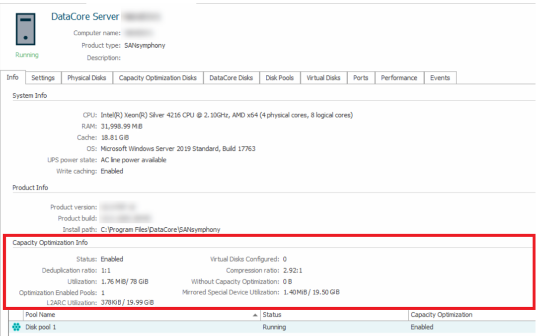 After a server is set up, and virtual disks are using Capacity Optimization, DataCore Web Console displays relevant statistics on Server Details page, on the Info tab. In the lower half of the page, there are several performance measures and a list of pools with Capacity Optimization enabled.