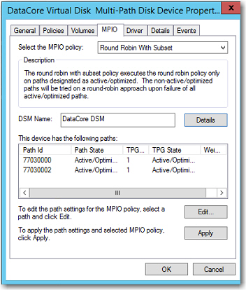 DSM (Device Specific Module) details can also be viewed and changed. The default DSM is DataCore DSM.