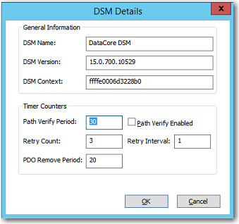 - To view DSM Details and change timer counter settings (which include Path Verify), click Details to open the DSM Details box. Make any changes and click OK to close the box.