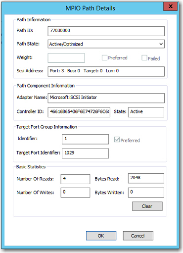 - To view or change path settings, select the path in the MPIO tab and click Edit to open the MPIO Path Details box. Make any changes and click OK to close the box.