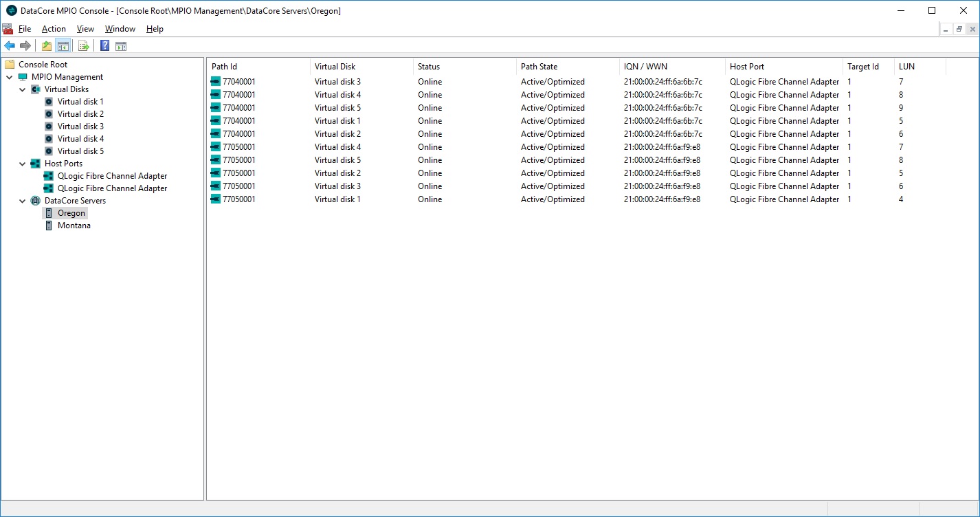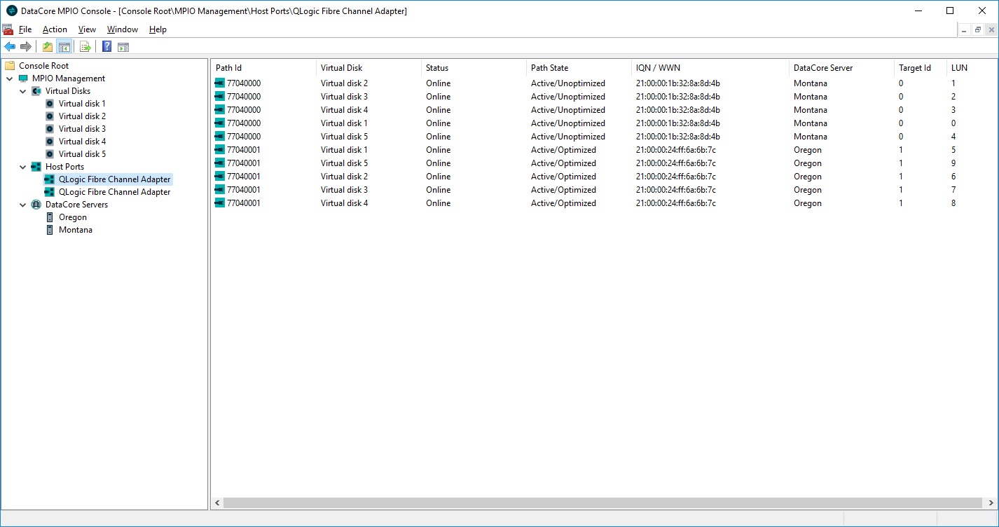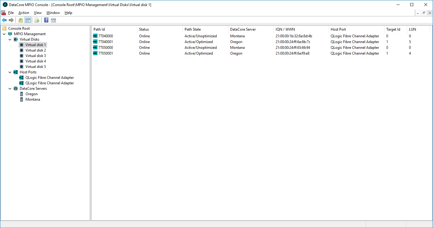 The MPIO Console is used to monitor multipath virtual disks and paths on the MPIO host server. There are three main components in the console tree: