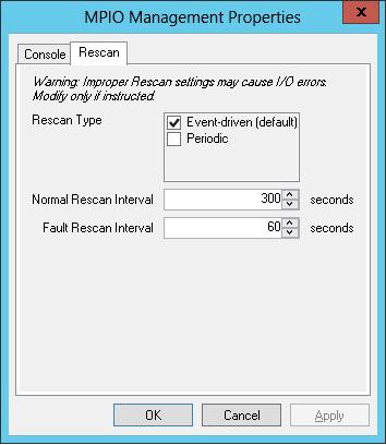 Improper rescan settings may cause I/O errors. DataCore highly recommends that administrators do not change the rescan settings unless instructed by DataCore Technical Support.