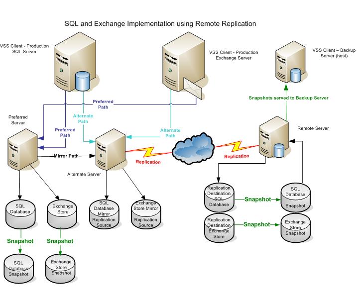 - Virtual disks have been served to the Production SQL and Exchange Servers and are being used as storage resources. Replications have been configured between the Alternate Server as the replication source and the Remote Server as the replication destination.