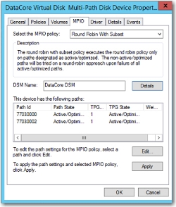 DSM (Device Specific Module) details can also be viewed and changed. The default DSM is DataCore DSM.