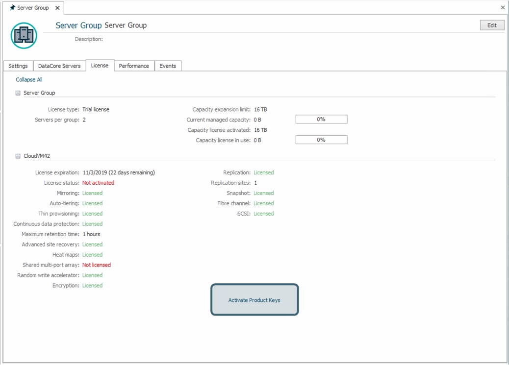 Product keys are a representation of a license that verify the authenticity and licensed use of this software. Some product keys are activated for all DataCore Servers in the server group and some product keys are activated individually for each DataCore Server. Multiple product keys can be activated at a time.