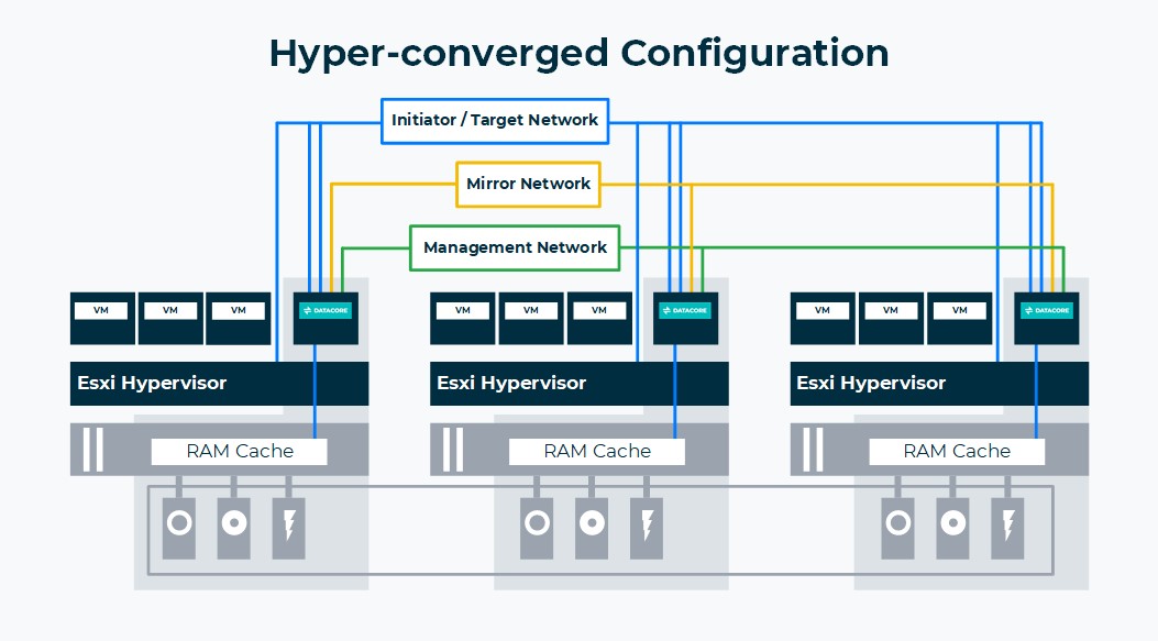 DataCore™ Hyperconverged Virtual SAN Software is used to create high-performance and highly-available disk pools using the local storage on application servers. The software may be installed on the host (such as a hypervisor, or virtual machine) to bring the advanced SAN features of the SANsymphony™ Software-defined Storage platform closer to running applications. The host in a DataCore Hyperconverged Virtual SAN configuration (also referred to as a Virtual SAN node) can take advantage of the same performance enhancing features used by dedicated storage servers; such as storage pooling, thin provisioning, caching, and auto-tiering. The host can also leverage the performance of locally-attached devices by reading and writing from fast server RAM and keeping data close to applications to avoid network latency issues.