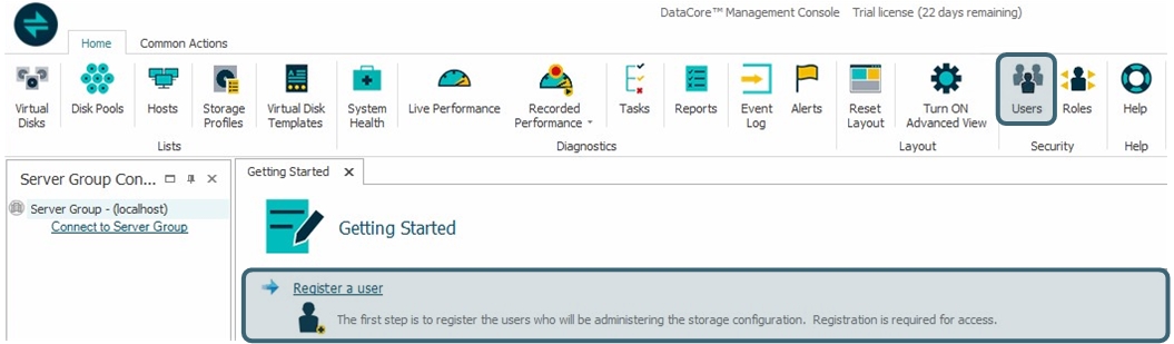 The Administrator account is added by default as a user when the software is installed. In this manner, a user may gain access to the DataCore Management Console after software installation in order to register users.