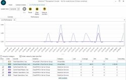 Live Performance for all objects can be displayed in the same window. The tool provides access to a complete list of counters for all objects. Performance data can be customized be selecting categories, instances (particular member of the selected category), and counters. For instance, if you choose the Virtual disks category, you can then select a particular virtual disk to monitor. When counters are added, the tool begins to run and data will be displayed. This tool is opened from the Ribbon in the Home tab, Diagnostics area.
