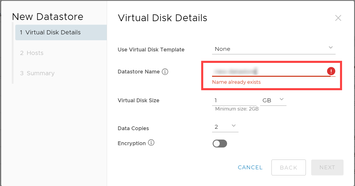 - The "Create New Datastore" workflow has been enhanced to allow unique Datastore Names. A warning message stating "Name already exists" is displayed while creating a new Datastore if the Datastore Name already exists.