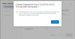 - A warning message is displayed while creating a new Datastore if the selected Virtual Disk Template has disk pools that do not have Capacity Optimization enabled.