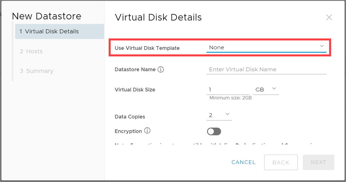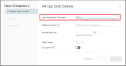- The Use Virtual Disk Template option in the "Create New Datastore" workflow has been updated to display only those templates that do not start with a "VVOL" tag.