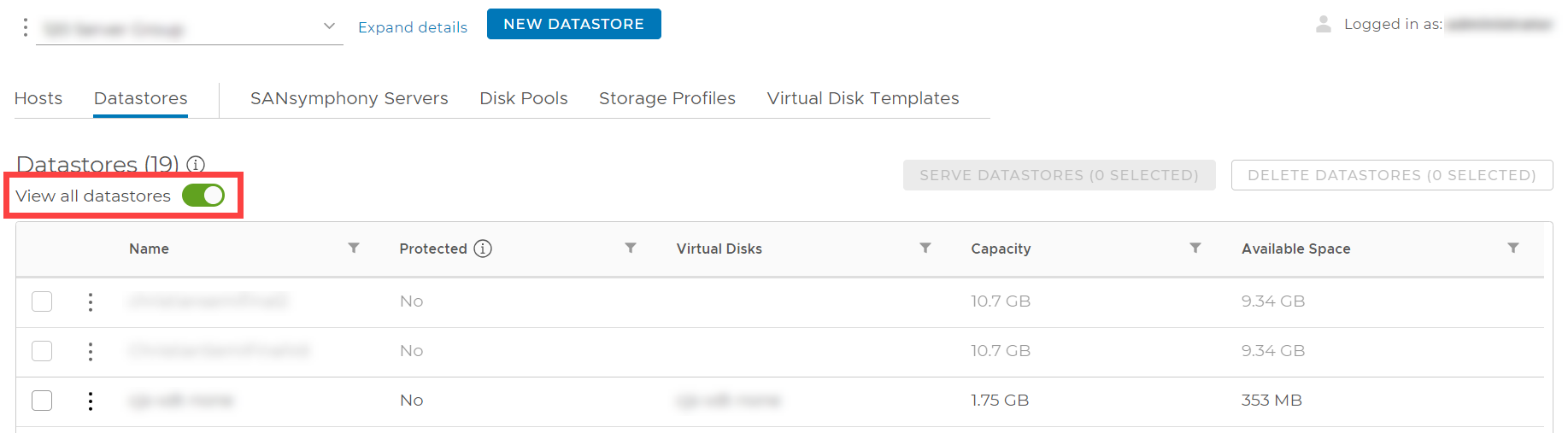 - A new option View All Datastores has been added to the Datastores table to display Datastores created outside the SANsymphony environment. Enabling this option disables the checkboxes to select all Datastores and non-SANsymphony Datastores.