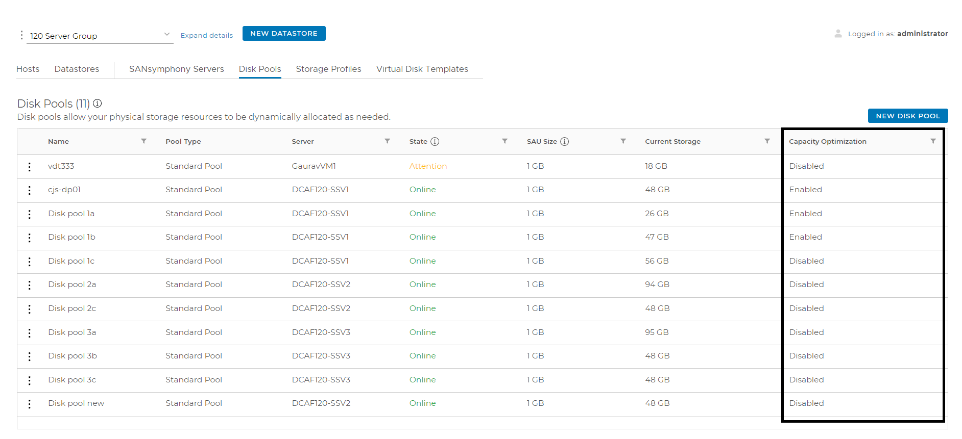 A new column "Capacity Optimization" has been added to the Disk Pools list page to enhance user expereince. It compromises four conditions: