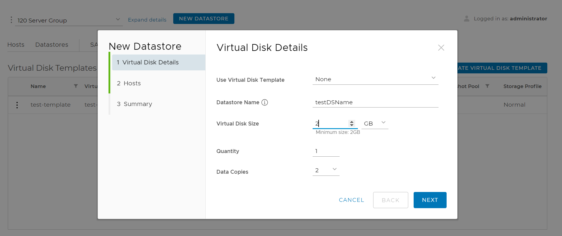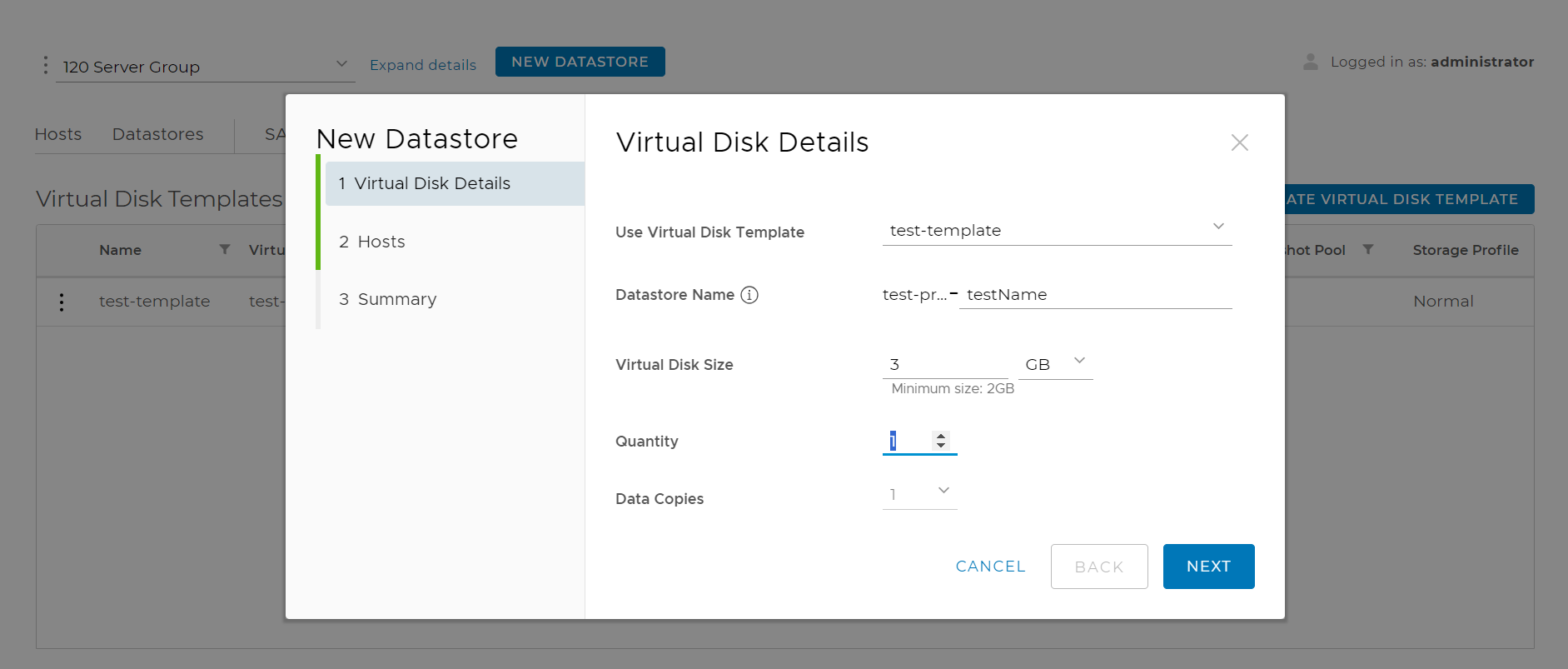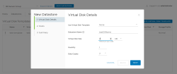 Count field with an upper limit of 10 has been added to enable the creation of multiple datastores with the same configuration when using a workflow with VD-Template.