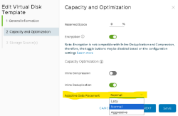 When creating or editing a virtual disk template, you can now choose the intensity of Adaptive Data Placement (ADP) (e.g., Lazy, Normal, or Aggressive). ADP will be visible only when ILDC features, such as Inline Compression or Inline Deduplication, are enabled. This allows you to control the level of optimization applied to the virtual disks within the template, optimizing data placement across the storage resources.